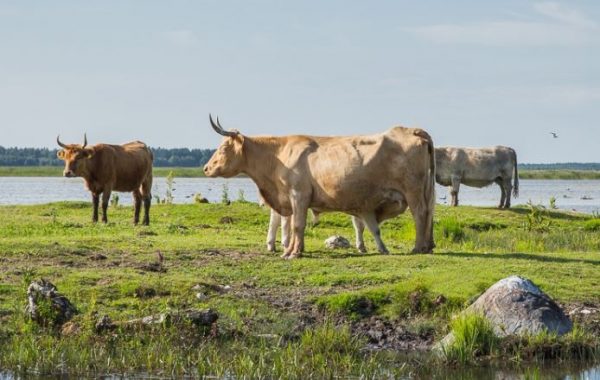 Enclosures for wild livestock have been set up in the Lake Engure Nature Park on a total area of more than 100 ha. Around 70 cattle – Latvian Blue, Highlander, Charole, Hereford and Alpengrey cows, as well as around 20 Polski Konik horses – graze in a 25 ha paddock at the Ornithological Research Centre and in another 36 ha paddock at Krievrag near Kūļciems.