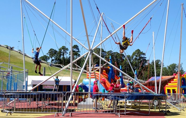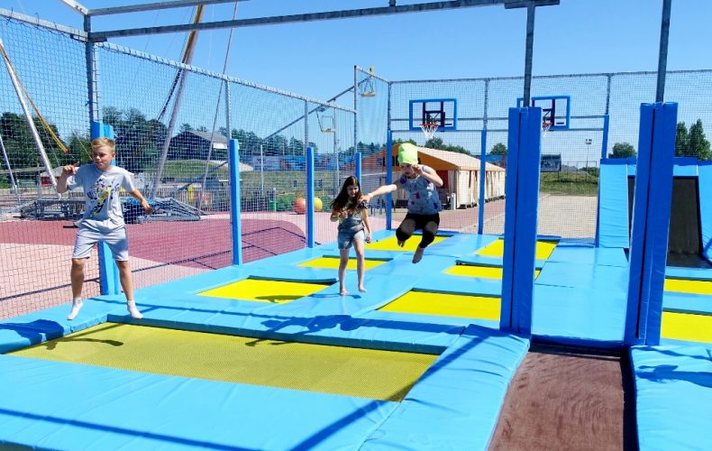The trampoline is suitable for children from 3 years of age and adults with a weight limit of 100 kg. The trampoline is 10 m wide and 15 m long and its jumping area is divided into 16 sections, so it can be used by 8 visitors at a time. The trampolines also have new and interesting features such as two inclined trampoline surfaces and basketball hoops.